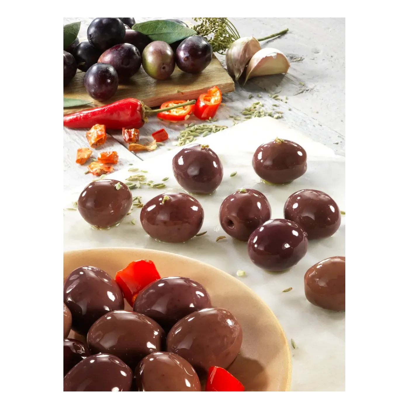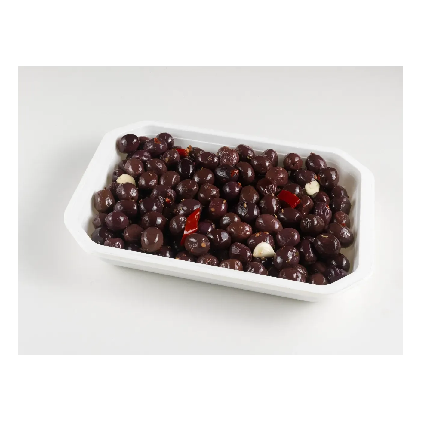 Olive selezionate e condite con aglio, origano, peperoncino, conservate in olio di semi di girasole. Gusto intenso e deciso per aperitivi e taglieri