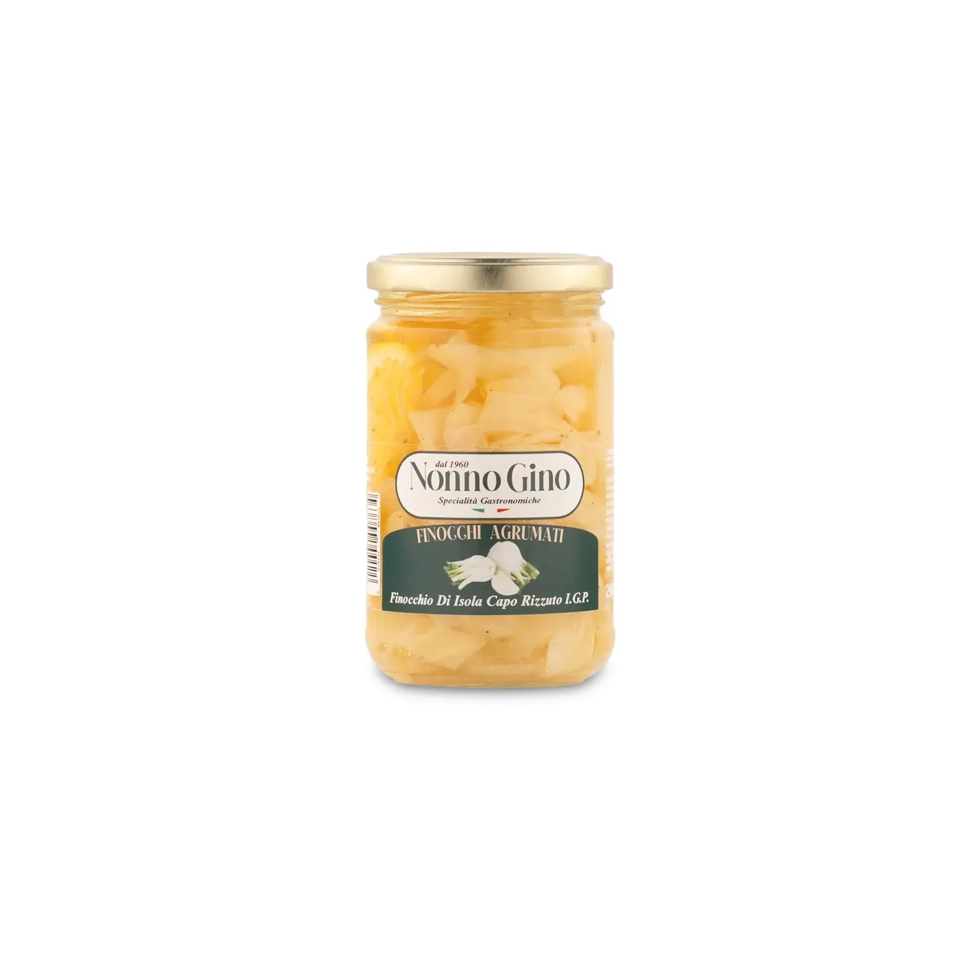 I Finocchi Agrumati Buscema sono realizzati con finocchi certificati I.G.P. coltivati nell’area di Isola Capo Rizzuto, in Calabria, rinomata per la qualità della materia prima. Il prodotto viene lavorato dal fresco. La conservazione in olio di semi di girasole, arricchita con scorze di agrumi e un pizzico di pepe nero donano al prodotto un profilo aromatico fresco e tradizionale della Calabria ionica. Pronto per essere gustato da solo ma anche per arricchire con creatività le preparazioni in cucina.