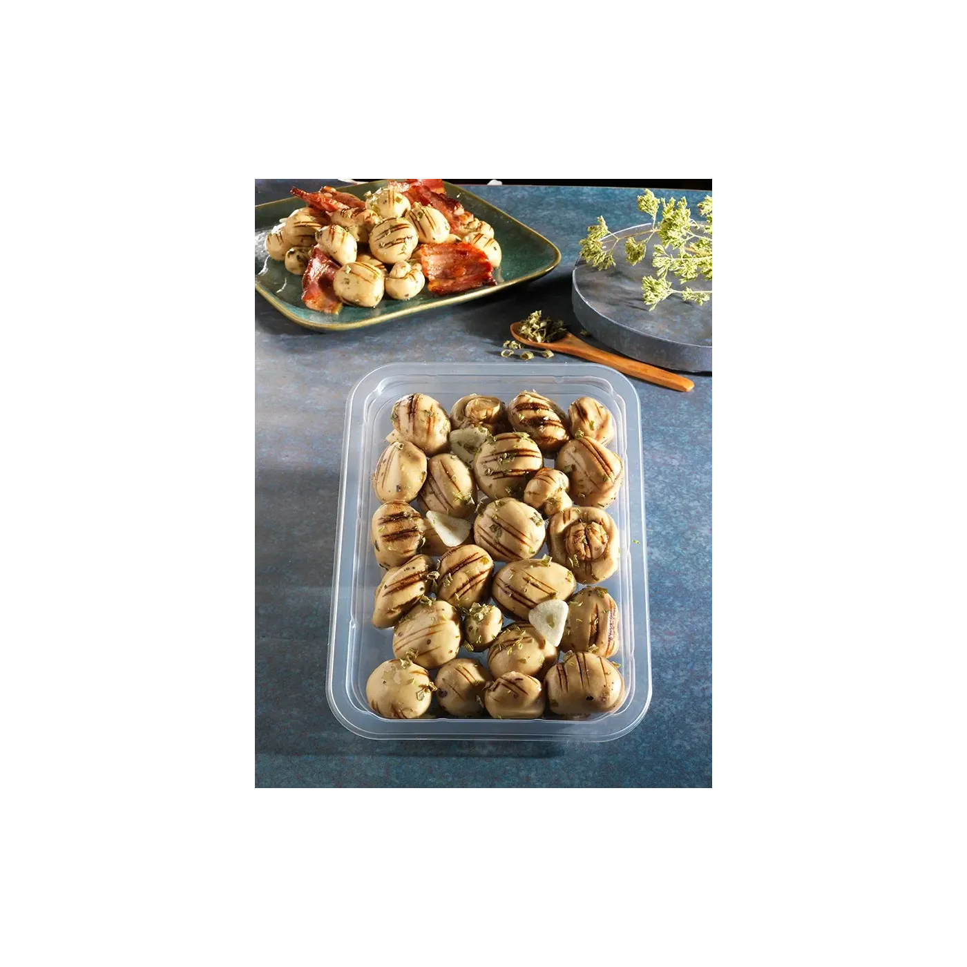I funghi grigliati Buscema sono lavorati da champignon freschi e coltivati in Italia. raccolti e selezionati per compattezza e integrità. Dopo essere stati lavati e grigliati vengono conditi a mano in olio di semi di girasole con un mix bilanciato di aromi mediterranei.