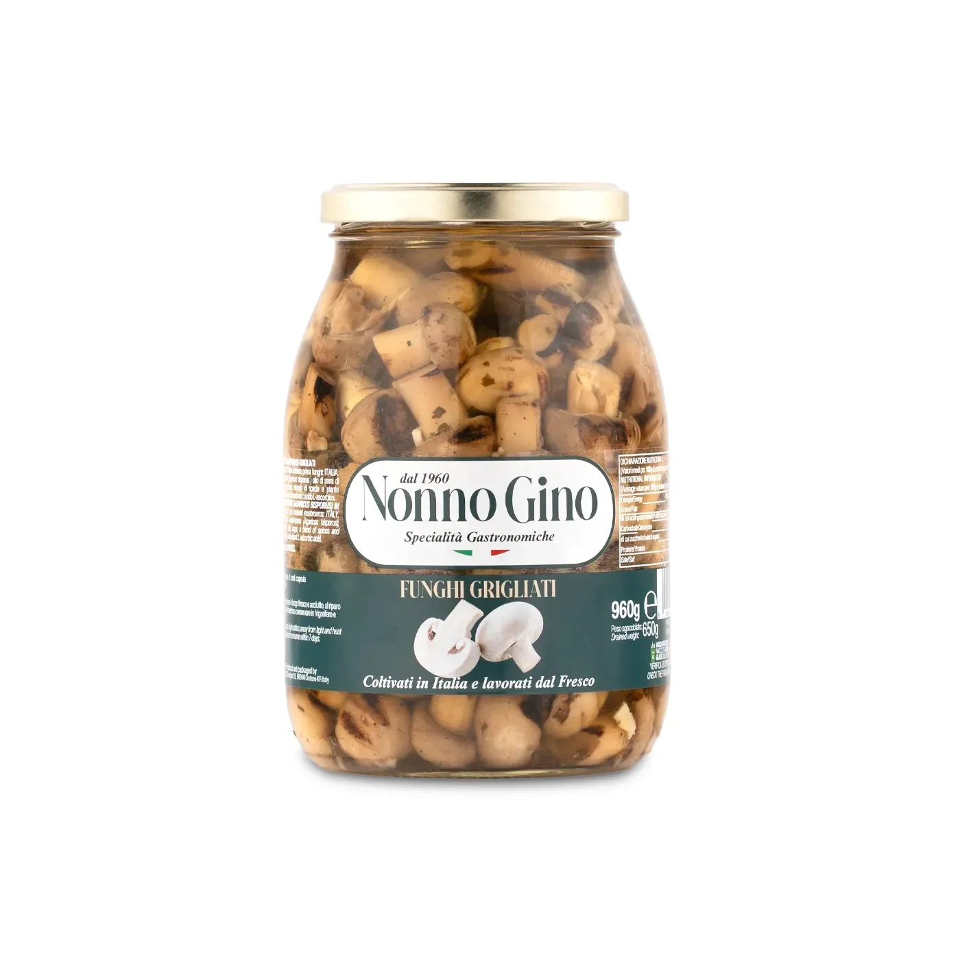 Funghi champignon coltivati in Italia e grigliati artigianalmente dal fresco. Conservati in olio di semi di girasole con spezie mediterranee.