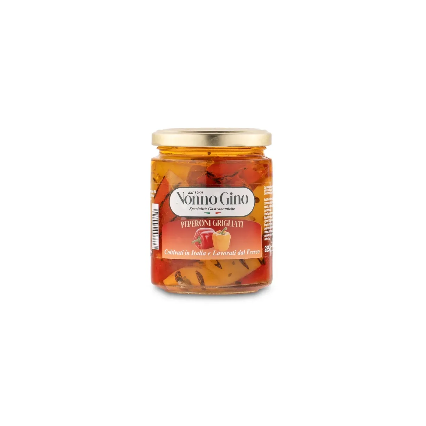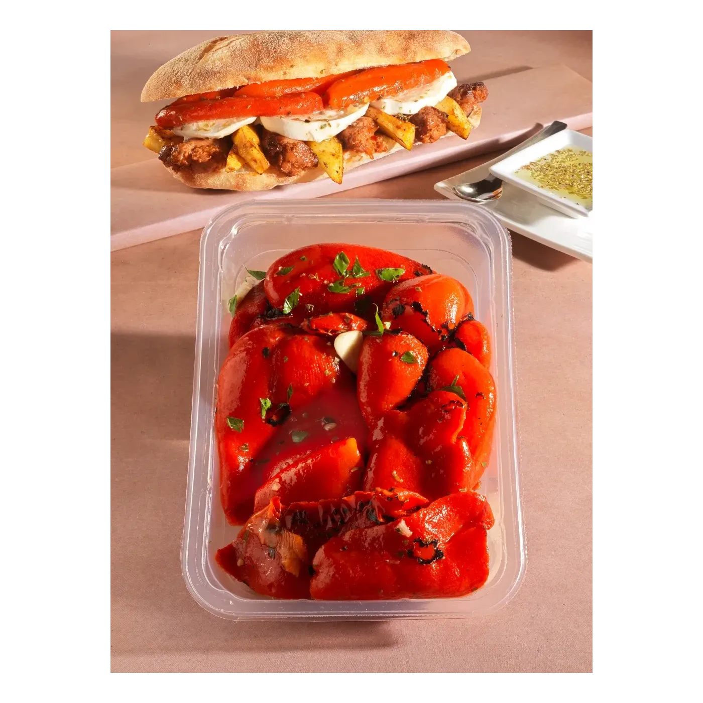 Peperoni grigliati artigianalmente e conditi con olio di semi di girasole e spezie mediterranee. Gusto dolce e autentico, subito pronto all’uso professionale