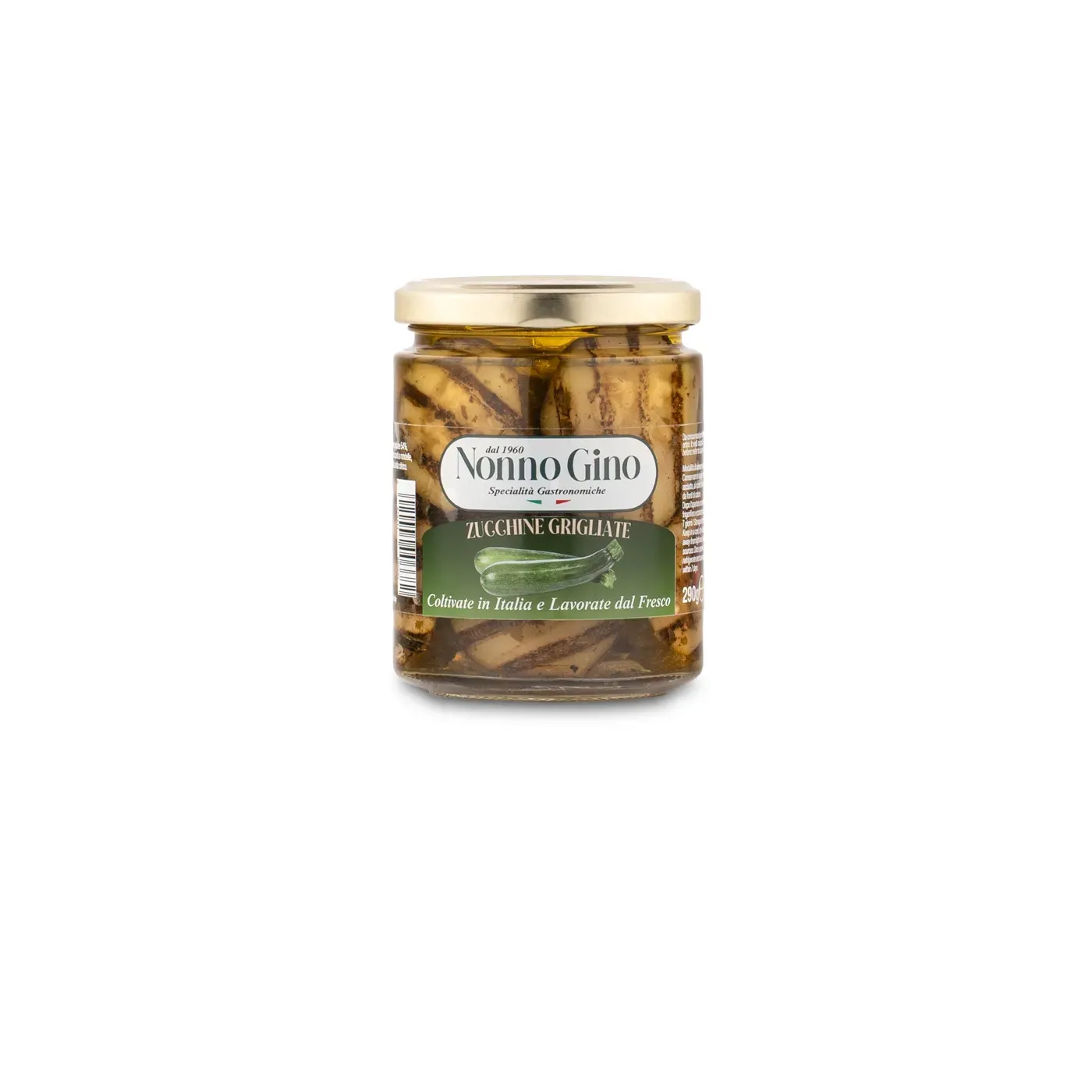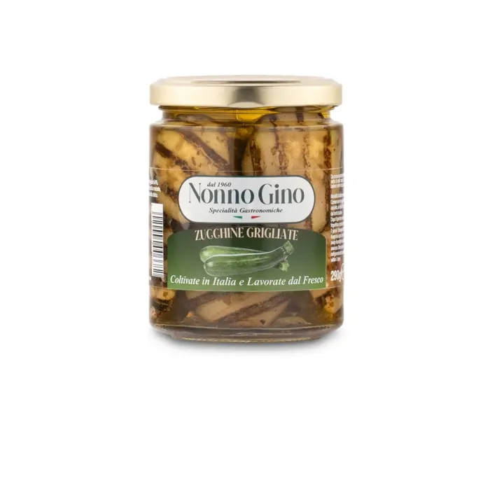Zucchine grigliate coltivate in Italia e lavorate dal fresco in olio di semi di girasole con un condimento bilanciato di spezie mediterranee. ideale per ristorazione e gastronomia professionale.