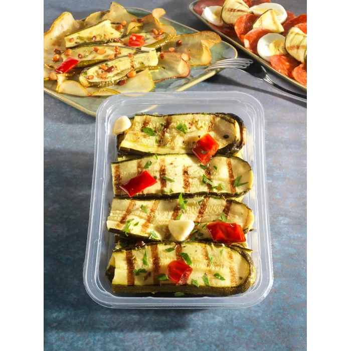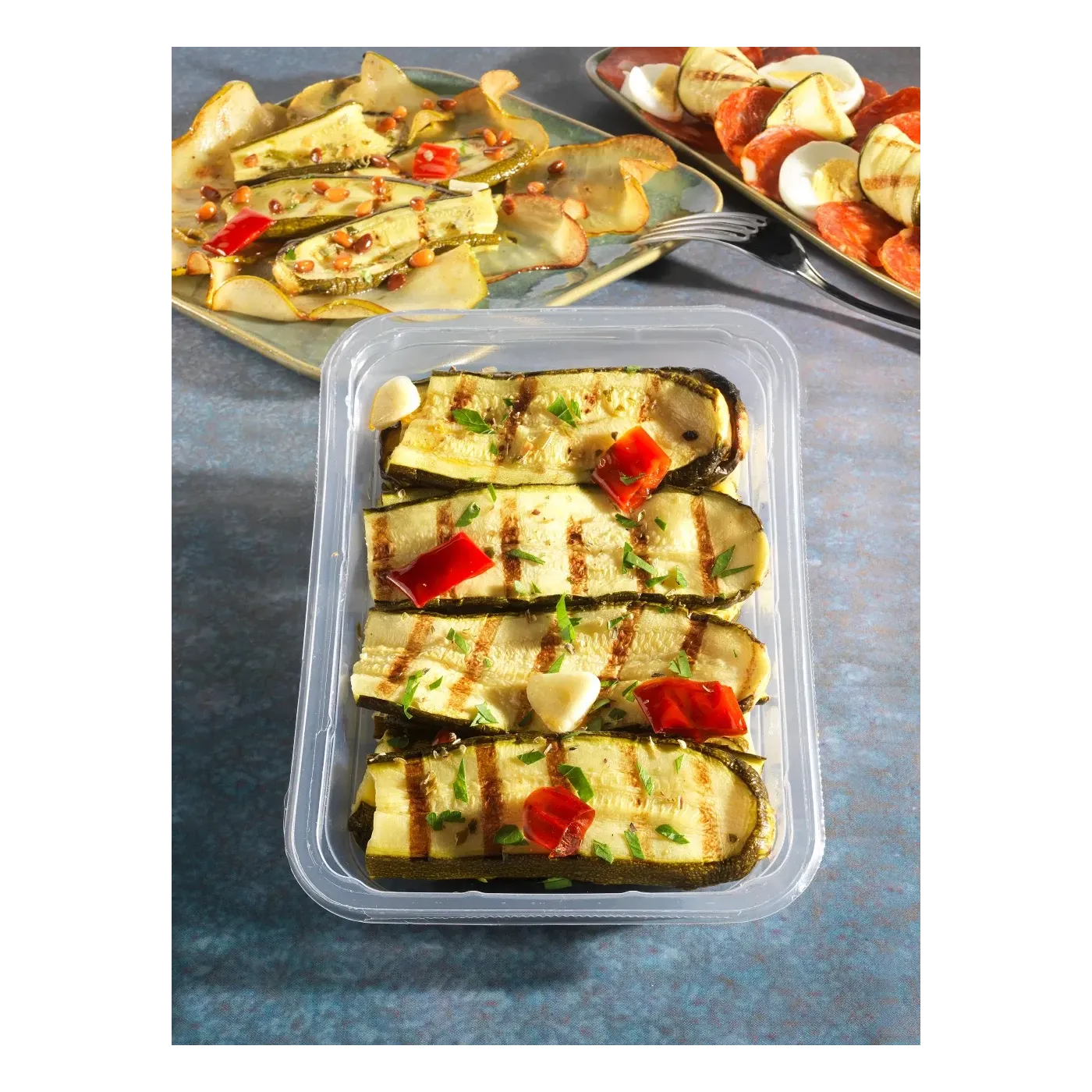 Zucchine grigliate coltivate in Italia e lavorate dal fresco in olio di semi di girasole con un condimento bilanciato di spezie mediterranee. ideale per ristorazione e gastronomia professionale.