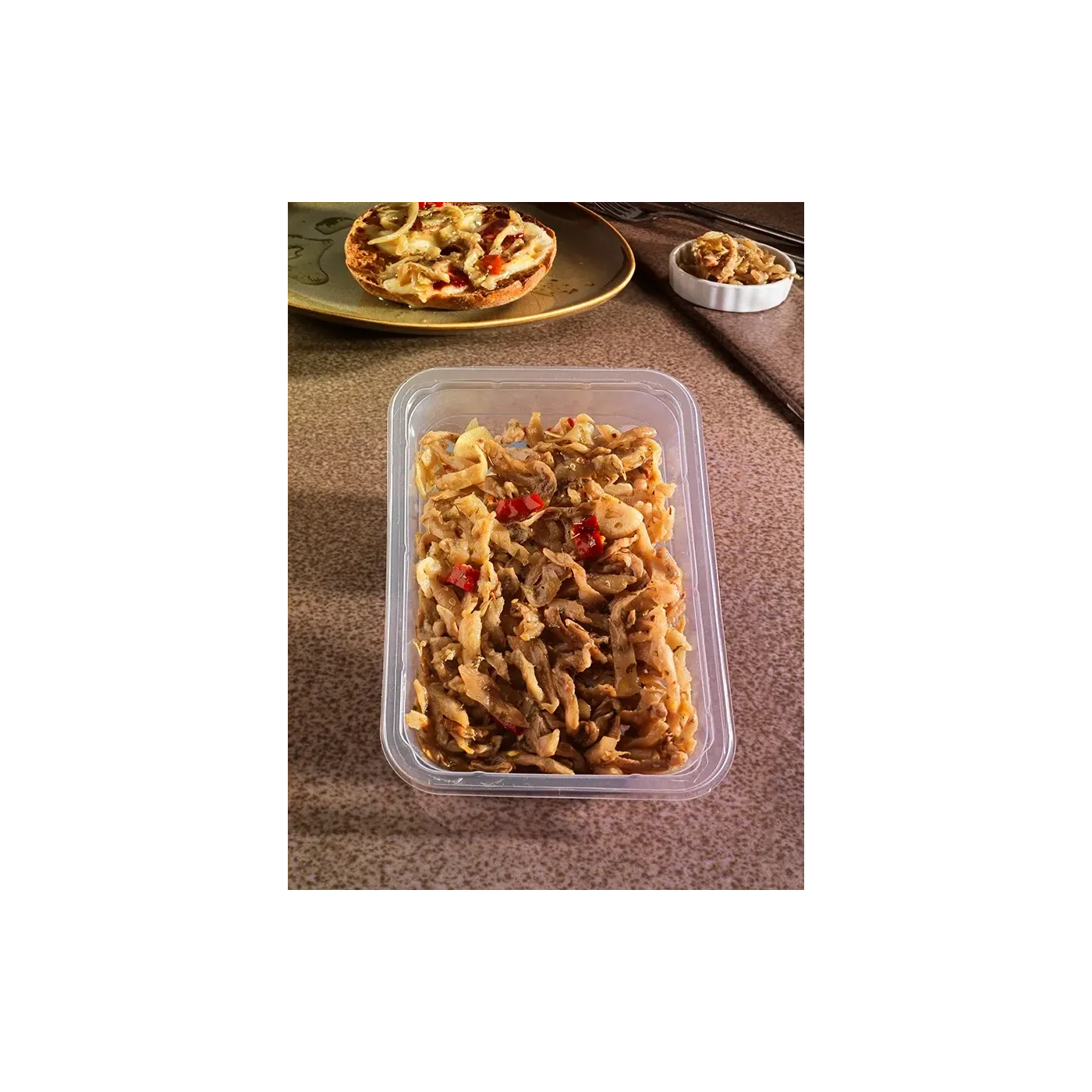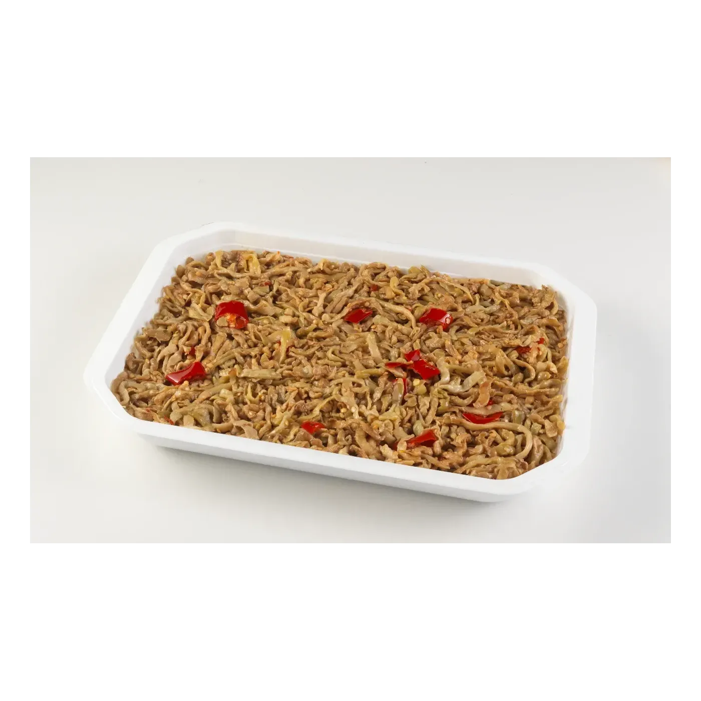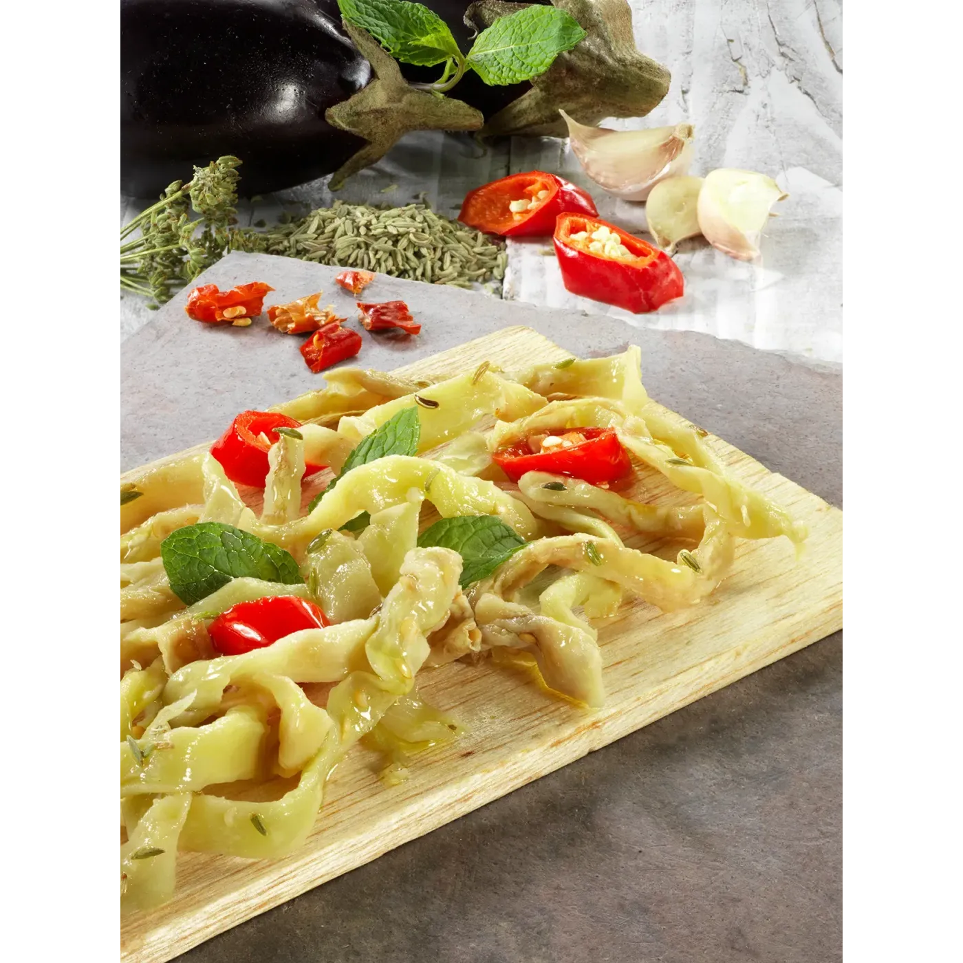 Melanzane a filetti lavorate da coltivazioni Italiane secondo la tradizione calabrese, conservate in olio di semi di girasole e aromatizzate con spezie mediterranee. Ideali per antipasti, gastronomia e catering.