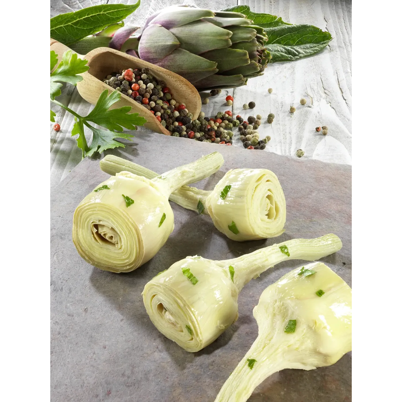 Carciofi interi con gambo, selezionati a mano e conservati in olio di semi di girasole. Pensati per la ristorazione professionale.